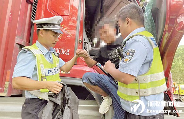 2023年6月29日,交警支隊高速三大隊四中隊接到群眾報警求助,一輛重型貨車發生追尾事故,現場有車油泄漏,隨時可能引起大火。吳耿鋒帶領隊員第一時間趕赴現場,到達現場后,吳耿鋒發現,大貨車車頭嚴重變形,情況十分危急。此時,被困的駕駛員被變形的車架緊緊束縛在座位上,一只腳也卡在方向盤下無法移動,司機痛苦的神情和無助的眼神,揪緊了吳耿鋒的心。時間就是生命,吳耿鋒和隊員們立即對事故路段實施臨時安全管控,設置警示標志,引導過往車輛有序通行,保障救援通道暢通,防止二次事故發生。隨后,吳耿鋒沒有任何猶豫,憑借專業技能和豐富經驗,立馬爬進駕駛室,用救援工具清理完障礙物后,把司機第一時間解救出來。之后,經過進一步治療,司機傷情已無大礙。