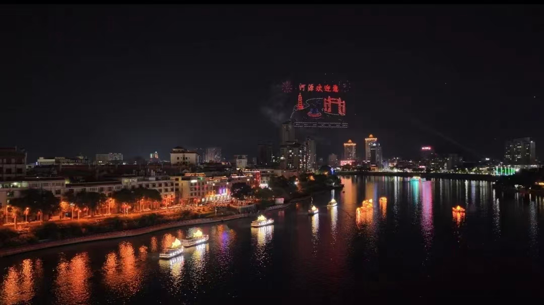 此次魚燈夜游活動以水、陸、空為平臺,以“魚燈”為筆,以“客家文化”為魂,精心打造了一場融合“水、陸、空”多維體驗的非遺盛宴。夜幕降臨,伴隨著主題曲《江湖漁火映河源》的悠揚旋律,近20艘船只在新豐江上緩緩巡游,恰似水中游龍,靈動而壯觀。隨后,無人機、“水上火壺”“飛龍飛鳳”等空中表演,與河源文化廣場分會場的煙花表演聯動綻放,演繹出火樹銀花、水火共舞的絕美場景。在新豐江畔,巡游隊伍手持非遺魚燈一路前行,并與沿途的非遺表演團隊、圍觀游客熱烈互動。大家伴隨著音樂節奏擺動身體、歡呼雀躍,形成了壯觀的“人河燈海”景象,現場氣氛熱烈非凡。