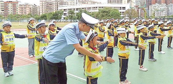民警手把手教小朋友交通指揮手勢(shì)操。